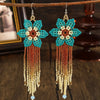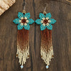 Deslumbra con estos aretes de estilo bohemio, elaborados a mano con cuentas de semilla, adornos artificiales y delicado tejido floral. Su forma graduada y detalles en vidrio encantador aportan movimiento, color y elegancia a cualquier look, perfectos para ocasiones especiales o para realzar tu estilo diario.